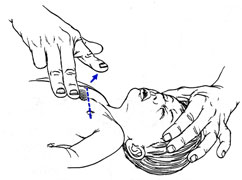 Se colocará una mano abierta sobre la frente y manteniendo el cuello en posición neutra en lactantes y en extensión ligera-moderada en niños. Se levantará el mentón, colocando la punta de los dedos de la otra mano debajo del mismo.
