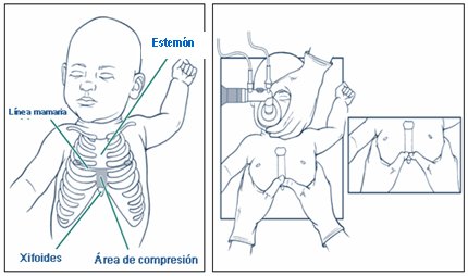 El punto del masaje cardiaco será el tercio inferior del esternón por encima del apendice xifoides tanto en el lactante como en el niño.