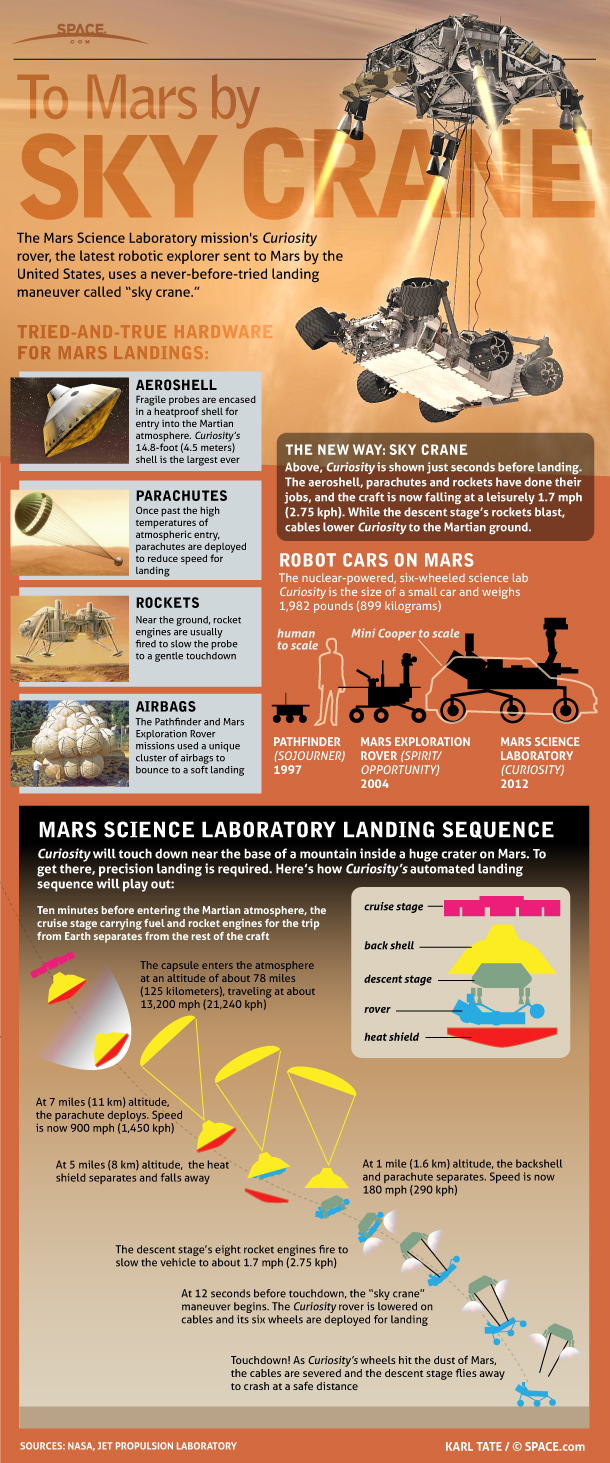 Infografía del rover Curiosity que llegará al crater Gale el próximo lunes 6 de agosto a las 7:31 am (hora peninsular) publicada en space.com