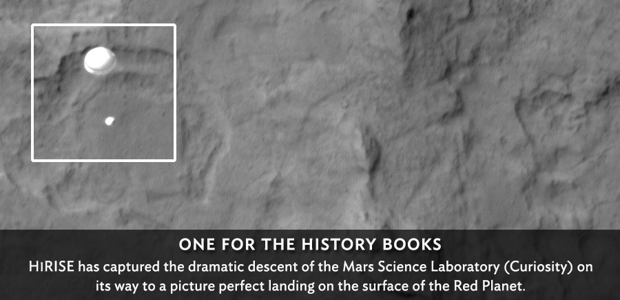 Más actualizaciones, imágenes recién enviadas (18:00h) por la MRO (Mars Reconnaissance Orbiter) del descenso del Curiosity esta mañana. Definitivamente el día de hoy va a pasar a la historia de la exploración planetaria.