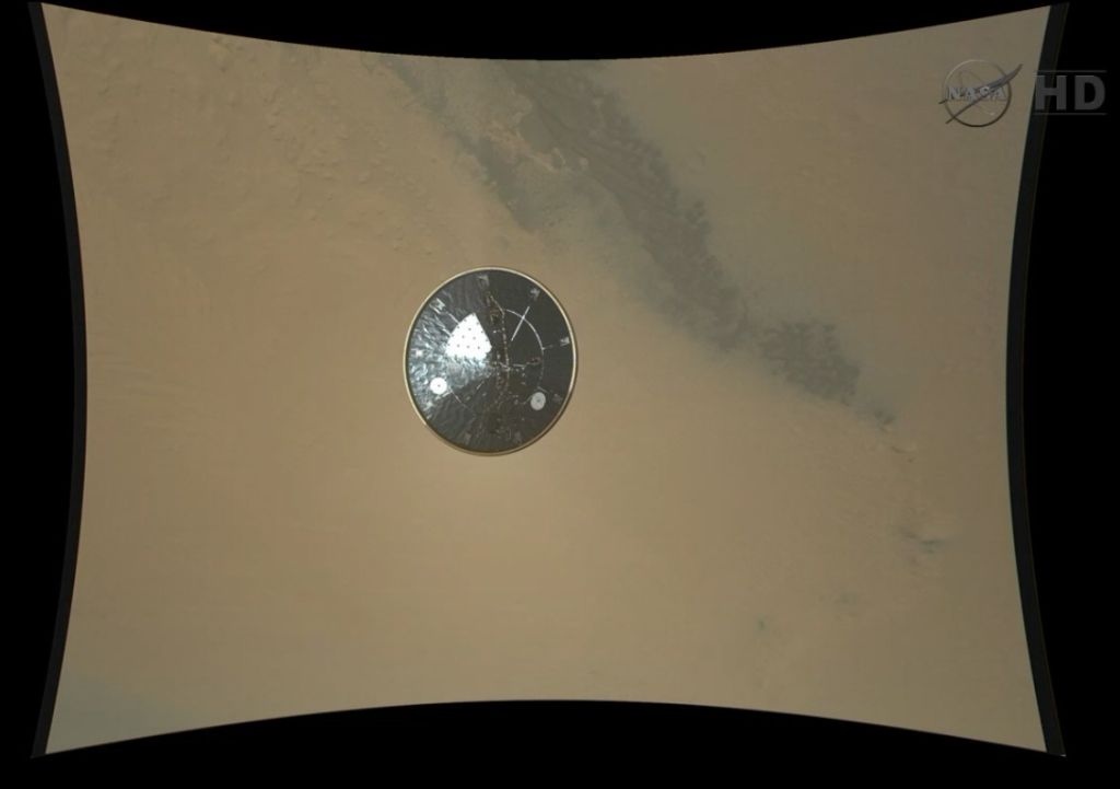 •Foto en alta resolución desde la cámara MARDI tomada durante el descenso del Curiosity. En primer plano el escudo térmico. Impresionante.