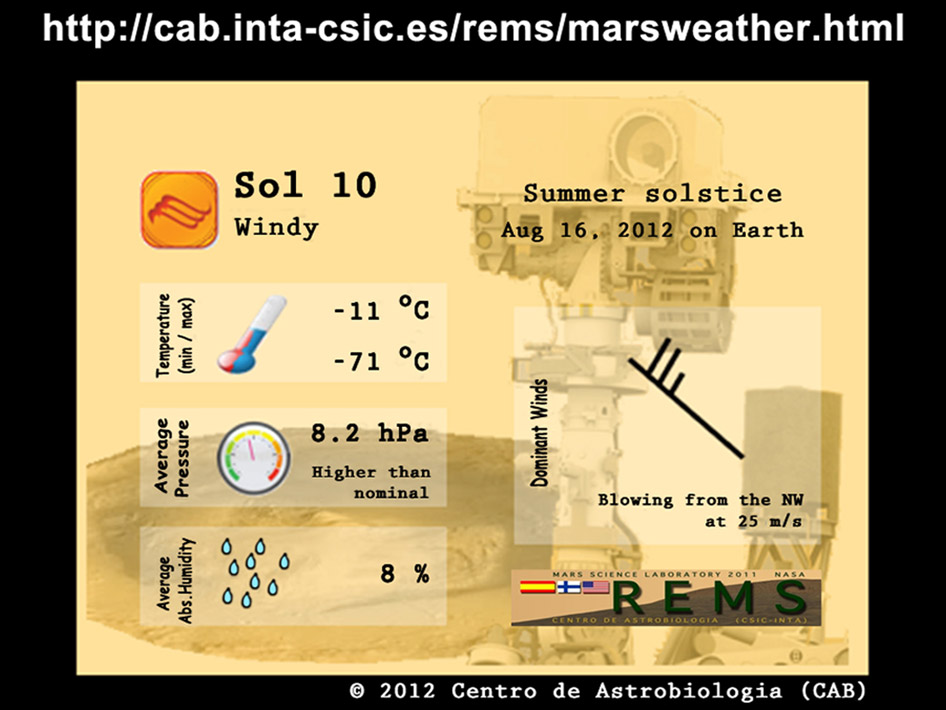 Se han recibido los primeros datos del instrumento español del Curiosity, el REMS, que se encargará de medir la presión atmosférica, humedad, radiación ultravioleta, velocidad y dirección del viento y la temperatura local del cráter Gale. Las primeras mediciones indican que el tiempo es soleado y frío (como suele ser el invierno de la zona ecuatorial marciana). Las gráficas de los primeros datos no dan lugar a muchas sorpresas.