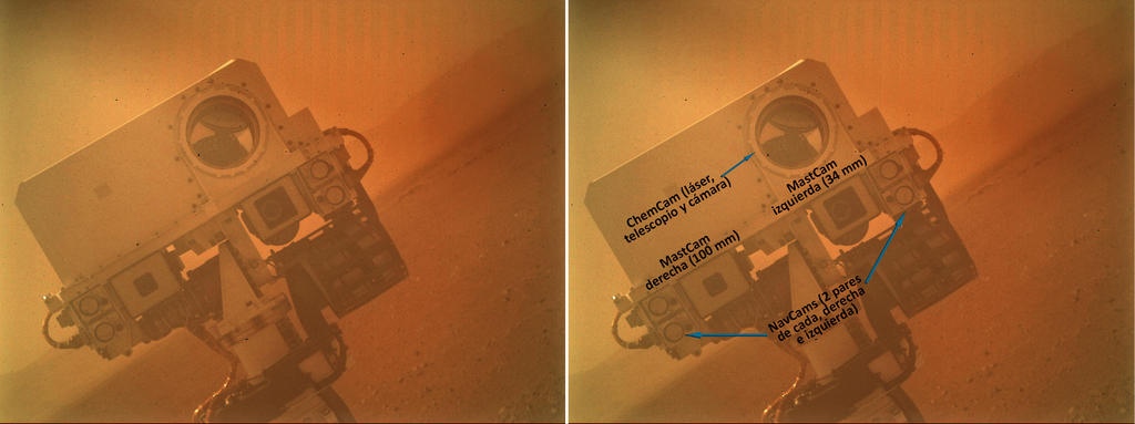 Es la cámara montada en el brazo robótico vista desde la MastCam durante sol 30 (5 de septiembre para los humanos). A la derecha se pueden ver el taladro que lleva el brazo y unas escobillas para limpiar el polvo marciano.