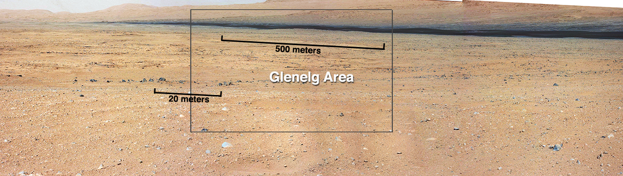 Los tres tipos de terreno que conforman el área Glenelg han llamado poderosamente la atención del equipo en tierra, sobre todo una zona de tonalidades más claras de la que se sabe que retiene durante la noche el calor que recibe por el día, sugiriendo una composición inusual. Además, a medida que se acercan a dicha zona están empezando a distinguir unas bandas oscuras de origen desconocido lo que le da al objetivo un valor añadido al que ya se le presumía.