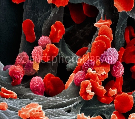 Eritrocitos rodeando a un linfocito coloreado en rosa. El color rojo proviene de la hemoglobina que les confiere la propiedad de transportar oxígeno a todo el cuerpo. No tienen núcleo y miden unas 7 micras de diámetro.