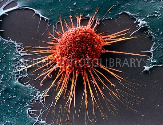 Célula de un cáncer de cervix. Llama la atención las numerosas proyecciones citoplasmáticas que le confieren una enorme motilidad. Este tipo de càncer es de los más frecuentes en mujeres y de los que tiene más altas tasas de mortalidad.