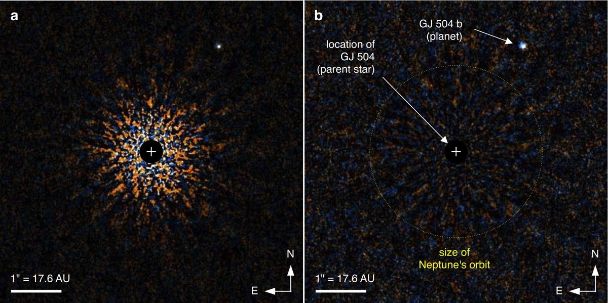 GJ 504 b es un planeta muy alejado de la zona habitable de la estrella a la que orbita, al menos 44 veces la distancia que separa la Tierra del Sol, más allá de la órbita de Plutón si lo comparamos con nuestro sistema solar. Estas enormes distancias facilitan a nuestros telescopios el poder captar el tímido brillo que reflejan planetas tan alejados de nosotros.