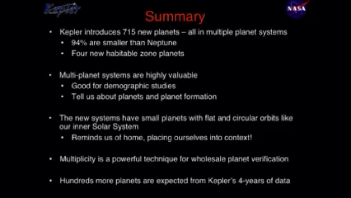 El resultado son 715 nuevos planetas confirmados fuera de nuestro Sistema Solar. Estos nuevos mundos orbitan alrededor de 305 estrellas, es decir la mayoría de ellos pertenecen a sistemas con múltiples planetas. La mayoría son de tamaños relativamente pequeños y orbitan en órbitas circulares y planas muy parecidas a las de los planetas de nuestro sistema solar interior.