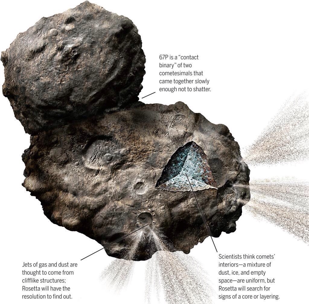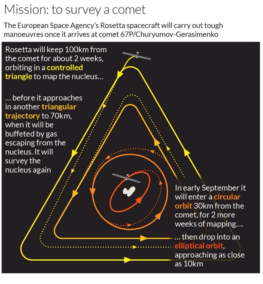 El cometa orbita a nuestra estrella cada 6 años y medio. El 15 de agosto de 2015 estará en su punto más cercano al Sol, apenas 185 millones de kilómetros. Durante la aproximación la sonda y Philae investigarán como cambia el cometa y el proceso de formación de la cola cometaria.
