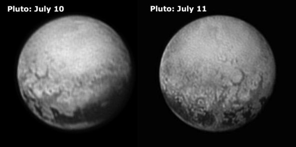 Estamos a tres días del sobrevuelo de Plutón por la New Horizons, ese máximo acercamiento se producirá sobre uno de los hemisferios del planeta enano quedando el otro «a oscuras». Teniendo en cuenta que el día en Plutón dura 6.4 días terrestres la imagen que abre el post es la de mayor resolución que tendremos en bastante tiempo del hemisferio contrario al sobrevuelo.