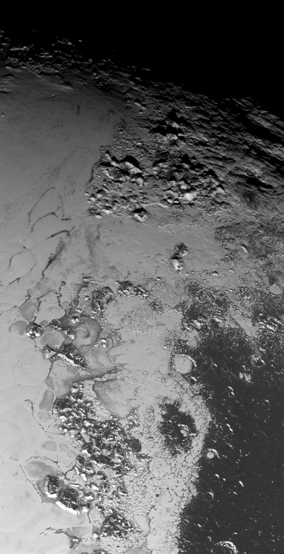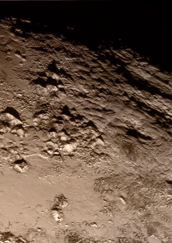 La primera imágen en alta resolución que ha llegado es sencillamente bestial. Se pueden ver enormes montañas de hasta 3.500 metros de altura formadas por hielo… Por hielo… Y según los primeros análisis nada de hielo de metano o de nitrógeno, esos materiales no pueden formar estructuras tan altas y compactas, hielo de agua…