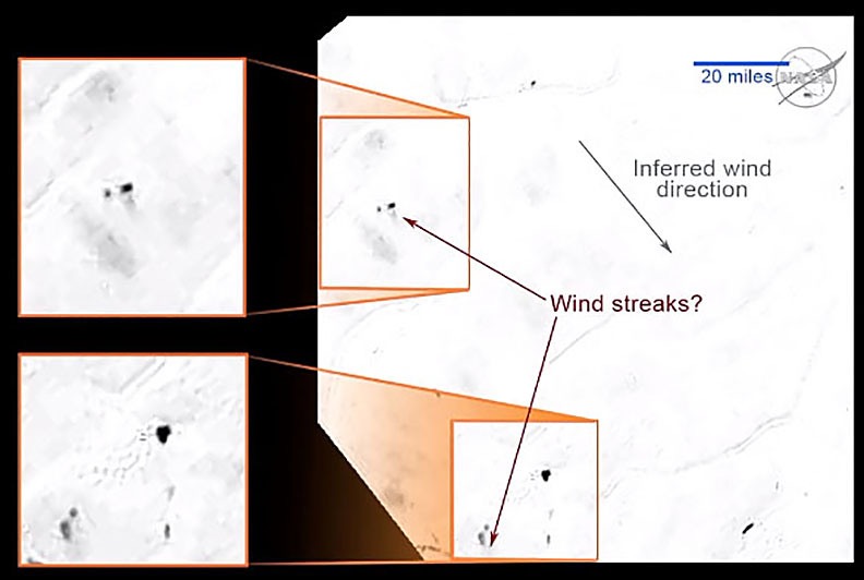 Pero es que dentro de esa imagen hay más sorpresas… Al norte de la Sputnik Planum vemos lo que podrían ser rastros de polvo orgánico movidos por viento… habéis oído bien viento que podría estar soplando a unos 10 kilómetros por hora. La otra explicación a estas manchas englobaría procesos volcánicos o jets en la superficie, algo a lo que mentalmente no estaríamos preparados aún…