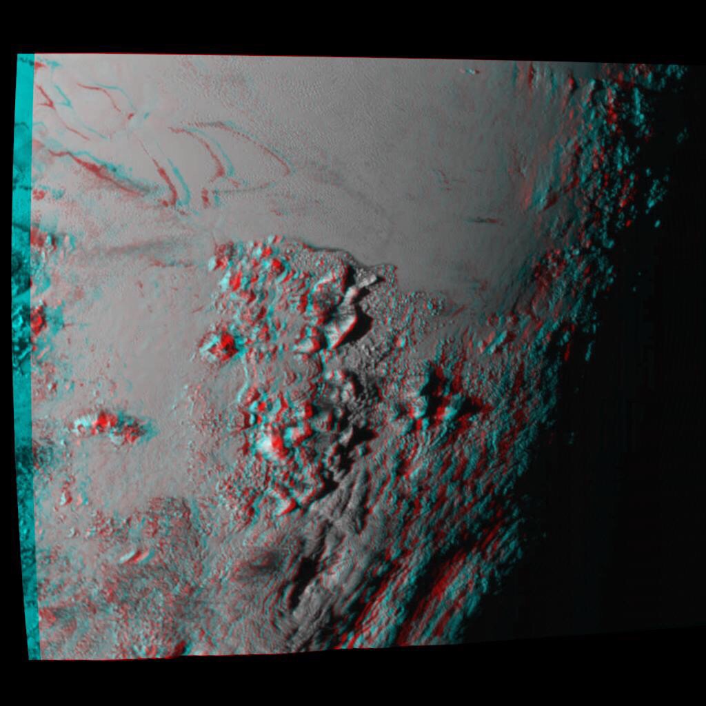 La imagen fue tomada por la cámara LORRI el 14 de Julio a unos 77.000 kilómetros de distancia de la superficie. Esta vez las montañas que vemos tienen entre 1.000-1.500 metros de altitud y parecen estar en un terreno bastante más antiguo que el de las primeras imagenes en la Sputnik Planum. Ahora si que podemos apreciar cráteres que podrían hacer suponer una edad de miles de millones de años.