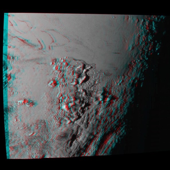 Algunas de estas formaciones llegan a tener hasta 3.300 metros de altitud, y lo más sorprendente es que puede que estén formadas por hielo de agua exclusivamente. El hielo de metano y de nitrógeno que está presente en toda la superficie de Plutón es incapaz de formar unas estructuras tan altas.