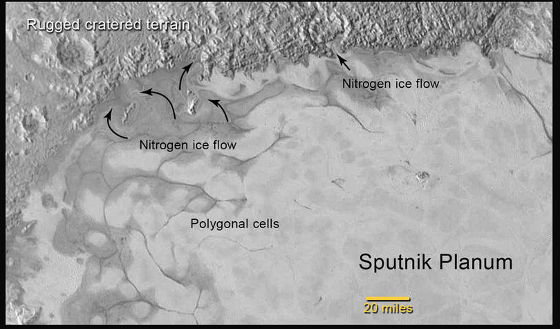 imagen en alta resolución de la Sputnik Planum. Al noroeste los flujos de hielo
