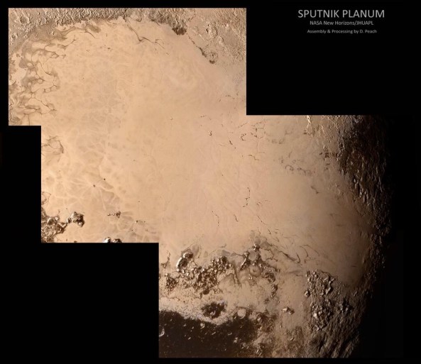 La «llanura del Sputnik» (como ha sido bautizada) es una zona situada al norte de las montañas heladas que veíamos en la primera imagen en alta resolución enviada ayer mismo. Es una superficie formada por segmentos irregulares de unos 20 kilómetros de ancho, rodeada de lo que parecen ser canales poco profundos. Algunos de estos canales parecen tener un material oscuro dentro de ellos, mientras que otros están perfilados por grupos de colinas que se elevan sobre el terreno circundante.