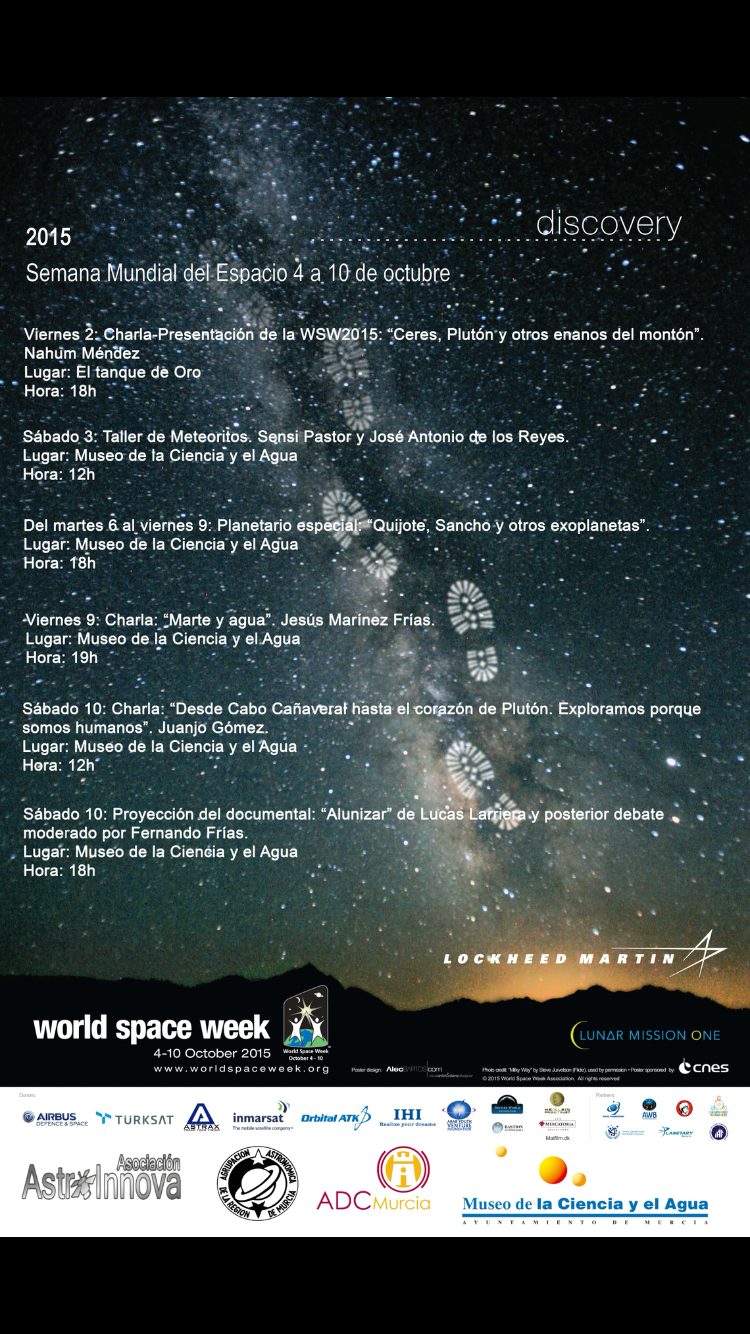 Por cierto el sábado 10 a las 12 horas daré una pequeña charla sobre algunos aspectos del viaje de la New Horizons, esta última noticia también se comentará. Os dejo el programa de la World Space Week de Murcia.