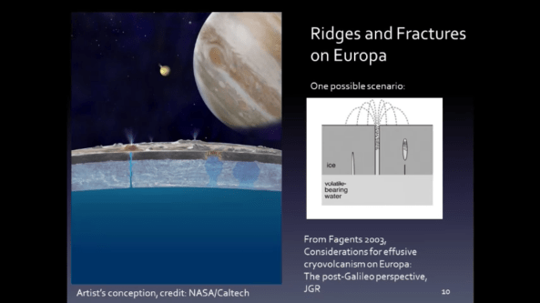 El modelo que se plantea es el de enormes plumas, con material proveniente de un océano subterráneo que contendría el doble de agua existente en todos los océanos de nuestro planeta. El material de esos jets volvería a caer sobre la superficie de Europa debido a la gravedad del satélite. Serían géiseres intermitentes, con una frecuencia de aparición mucho menor que los hallados en Encelado, localizados en la zona del polo sur.