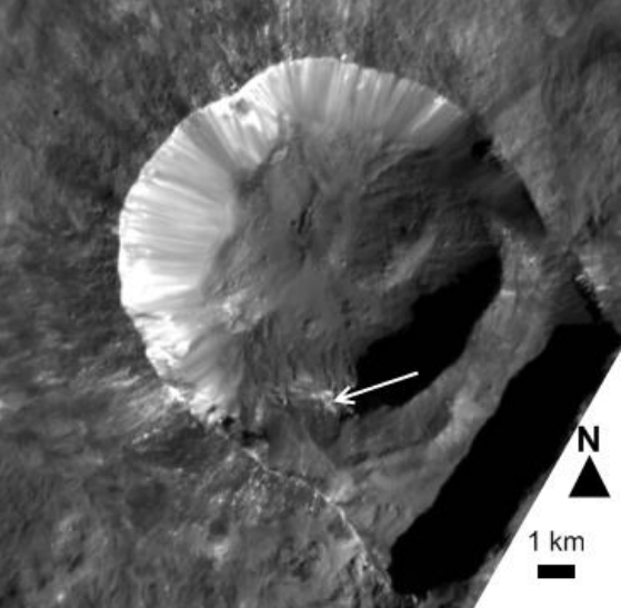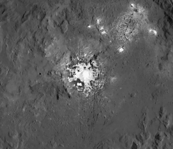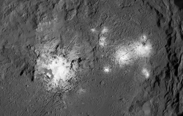 Los brillantes depósitos de carbonato sódico, localizados en Occator desde las primeras instantáneas que se tomaron desde Dawn, adquieren ahora una resolución espectacular, permitiendo caracterizar en profundidad las regiones que separan el material brillante del oscuro. Los depósitos encontrados en Vinalia Faculae son los mayores acumulos de carbonatos existentes fuera de nuestro planeta (al menos que hayamos observado hasta ahora). Nadie se explica aún como ha podido acumularse todo este material en superficie, ya sea de una fuente superficial de agua rica en minerales, o de una más profunda rica en sales,…