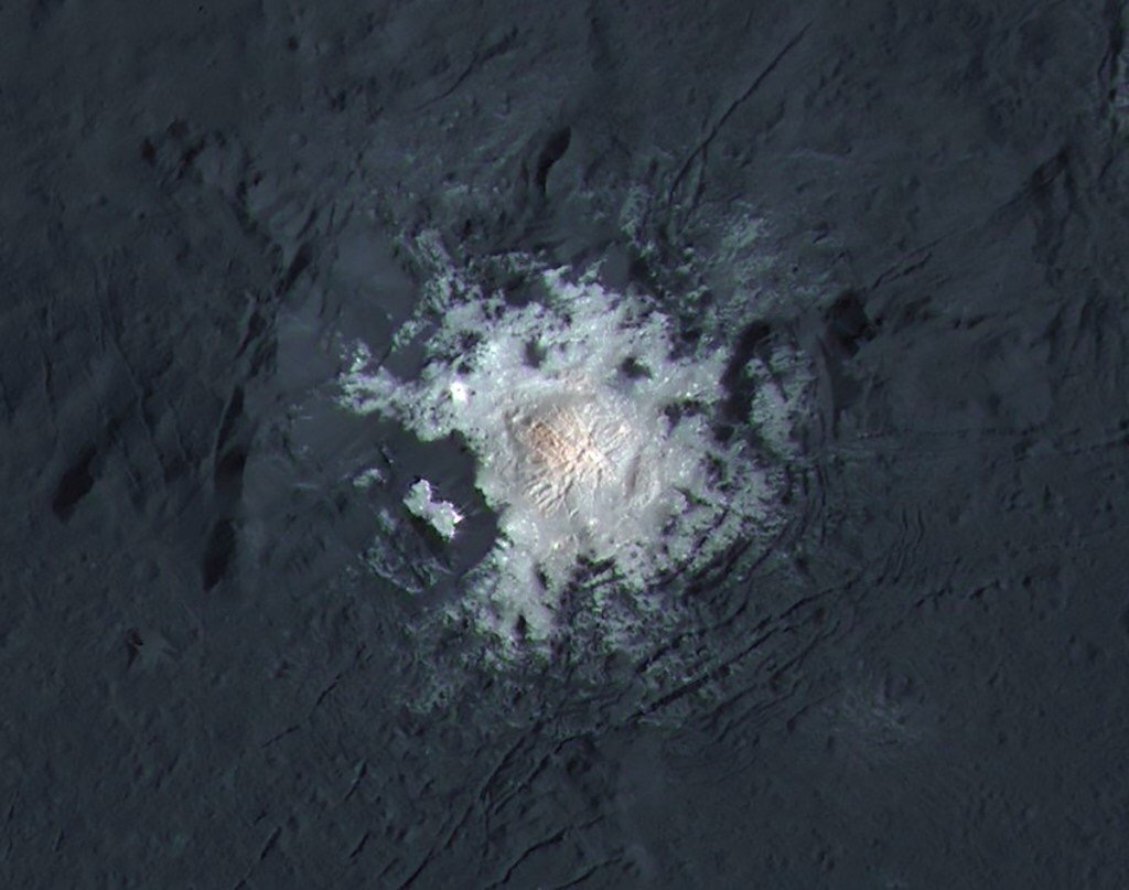Los brillantes depósitos de carbonato sódico, localizados en Occator desde las primeras instantáneas que se tomaron desde Dawn, adquieren ahora una resolución espectacular, permitiendo caracterizar en profundidad las regiones que separan el material brillante del oscuro. Los depósitos encontrados en Vinalia Faculae son los mayores acumulos de carbonatos existentes fuera de nuestro planeta (al menos que hayamos observado hasta ahora). Nadie se explica aún como ha podido acumularse todo este material en superficie, ya sea de una fuente superficial de agua rica en minerales, o de una más profunda rica en sales,…