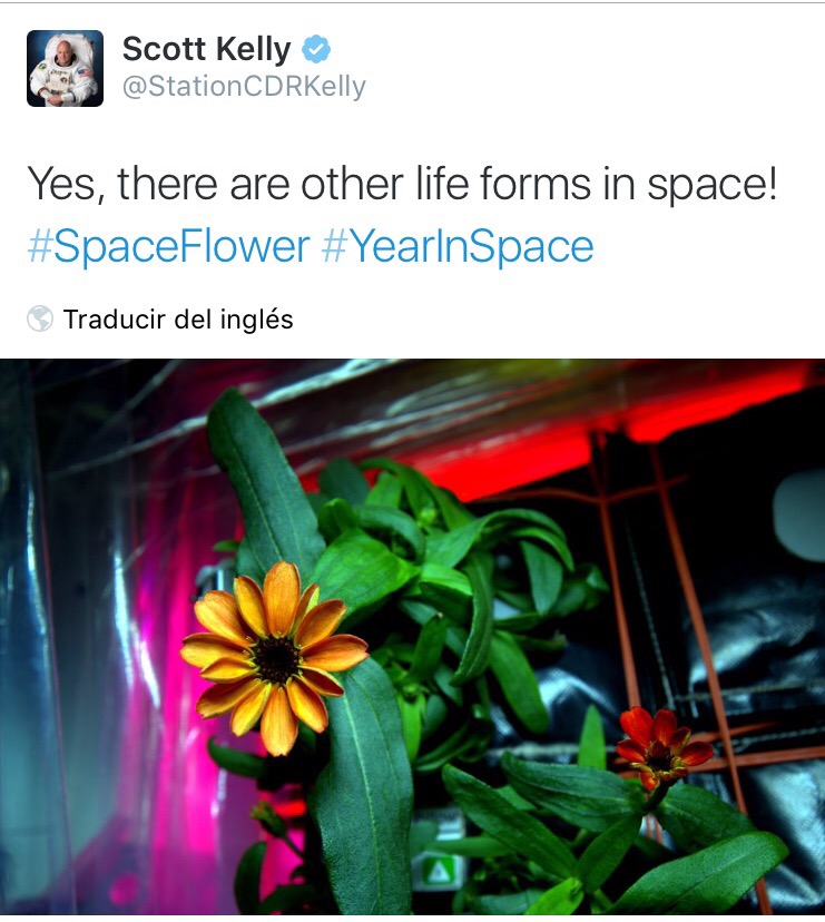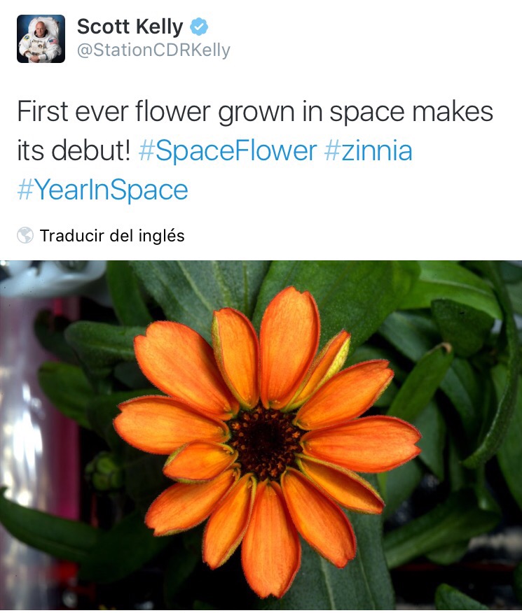 Ayer el astronauta Scott Kelly lo anunciaba en su twitter. Una instantánea de la primera flor que ha conseguido prosperar en la estación espacial internacional.