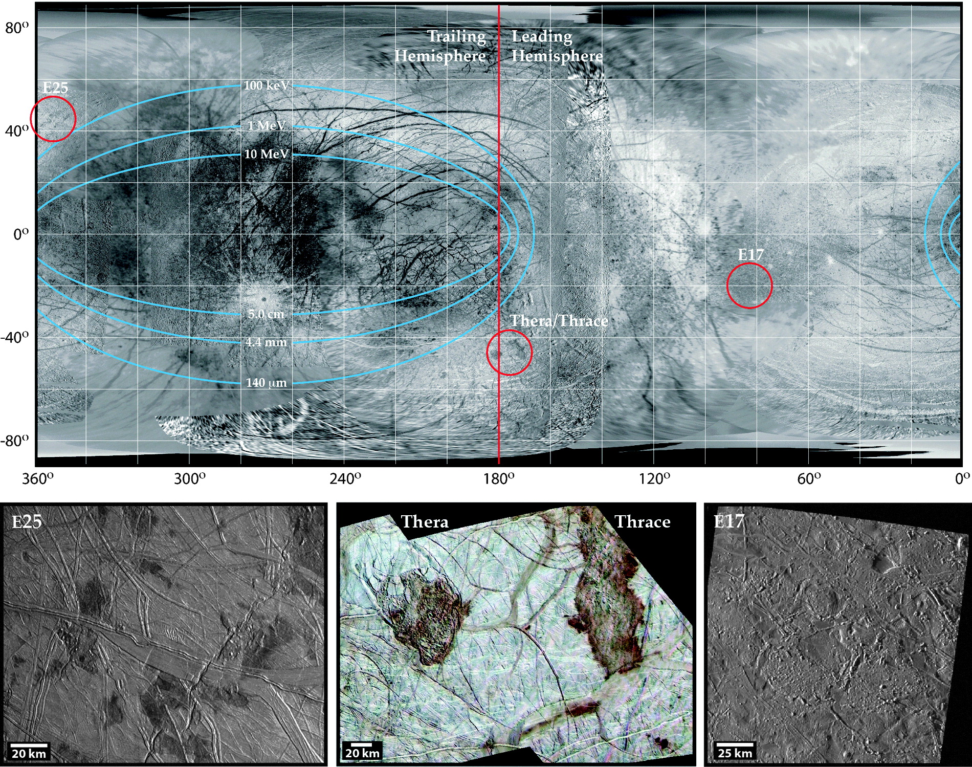 Los lugares más interesantes para colocar la misión se sitúan en latitudes bajas, necesitamos recoger muestras lo más recientemente derivadas del océano interior, por lógica estarán menos expuestas a la intensa radiación ambiental y serán más representativas de lo que se encuentra por debajo. Estas zonas se caracterizan por un color más oscuro que el resto de la superficie. Recientes estudios señalan a la región conocida como Thera Macula situada en el hemisferio sur como una zona activa hoy en día, es decir, puede existir agua proveniente del interior en estos momentos. Un excelente sitio para ir.