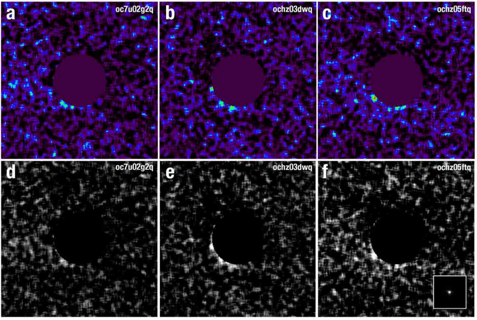 El primer recuadro azulado (en la imagen abajo a la izquierda) nos muestra la firma del hidrógeno atómico, aparece en la propia estrella, pero no a su alrededor. En el segundo recuadro vemos lo que realmente forma la burbuja donde se encuentra refugiado el embrión estelar, hidrógeno molecular en verde e hidrocarburos complejos en rojo (tercer recuadro). Esto indica que la burbuja es, en realidad, la parte superior de un denso pilar de polvo y gas que está siendo expulsado por la radiación del cúmulo de estrellas jóvenes y masivas situado en la parte inferior derecha.