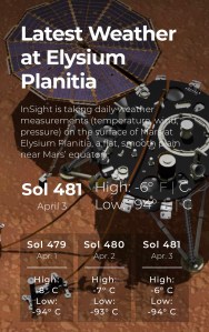 Hoy en Elysium Planitia, una llanura que se extiende a ambos lados del ecuador marciano, la temperatura máxima ha sido de -6 grados centígrados, el viento ha soplado en dirección oeste a unos 20 kilómetros por hora,… lo normal en esta época del año marciano.